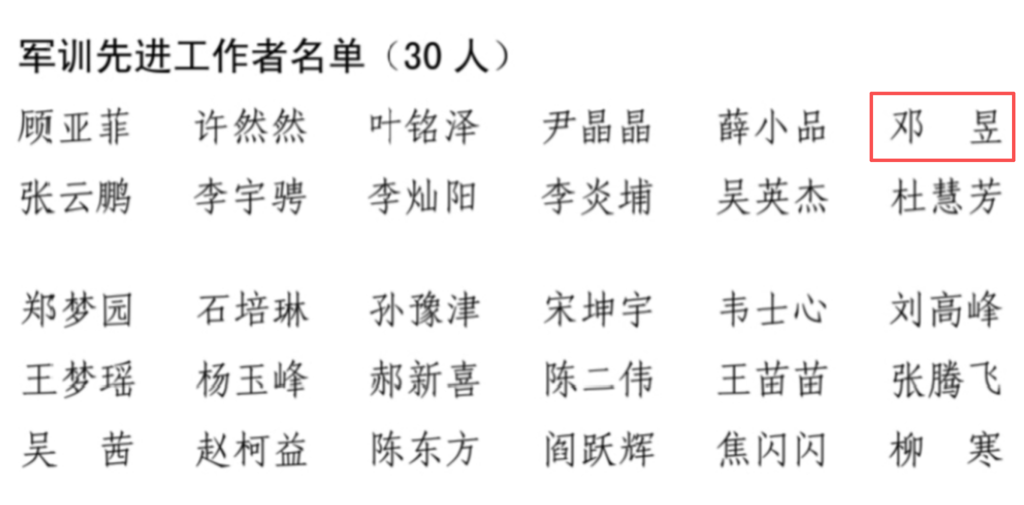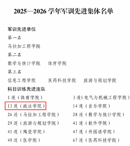 在平顶山学院2025-2026学年学生军训中,政法学院表现优异,荣获“科目训练先进连队”荣誉称号。其中,辅导员邓昱以对军训工作的科学统筹和对参训学生的全程关怀,获评“军训先进工作者”称号;孙丰泽、贾梓怡、李垚礼、韩梦蝶等四名同学则凭借过硬的军事素养和优良的作风纪律,荣获“军训先进个人”称号,为学院集体荣誉增添了亮丽一笔。