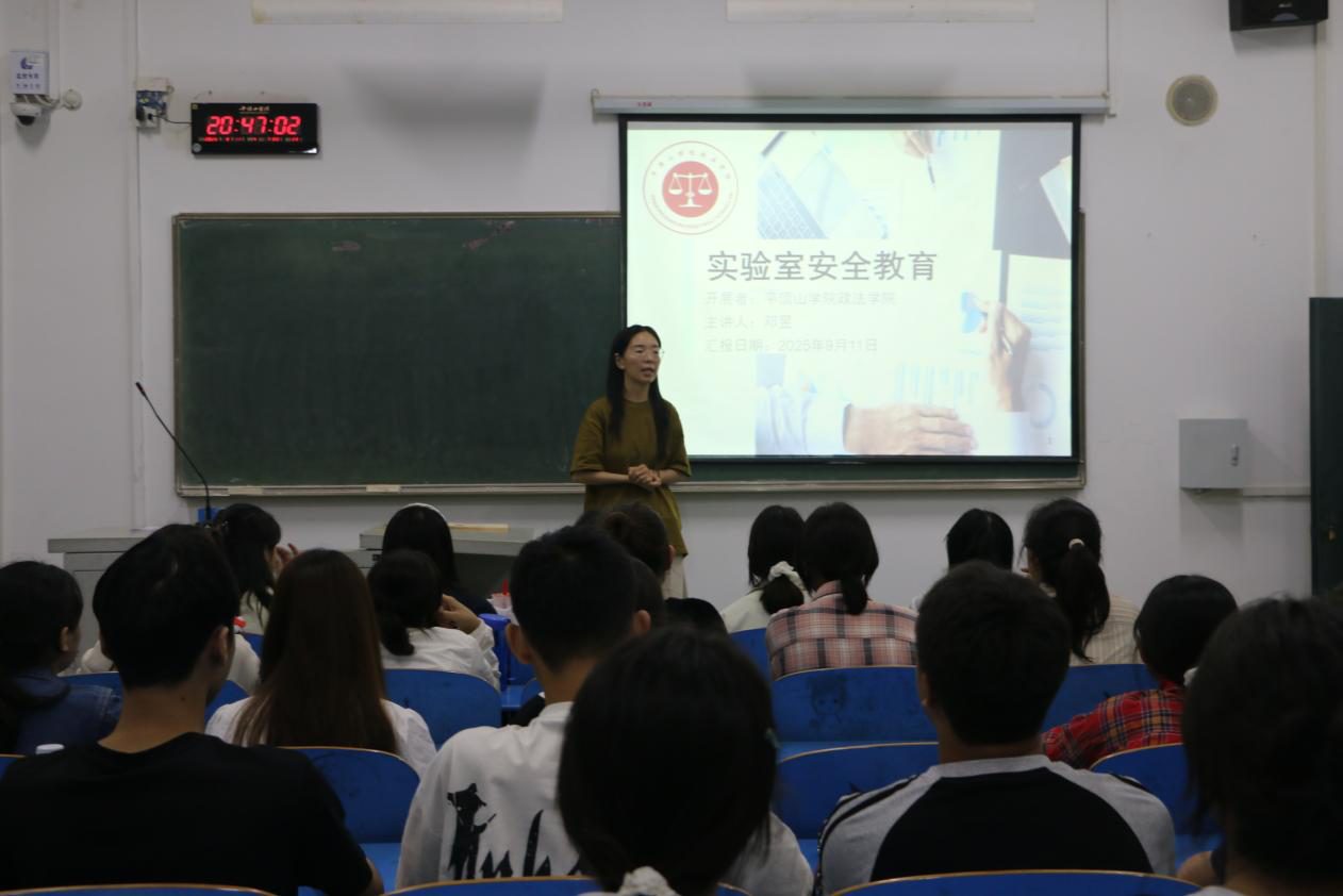 为贯彻学校关于实验室安全管理的工作要求,落实“安全第一、预防为主”的管理理念,切实保障学生人身安全与实验室教学秩序,9月11日晚,政法学院在教学楼2410教室开展2025级新生实验室安全教育专题培训。全体新生参加培训,辅导员邓昱主讲。
