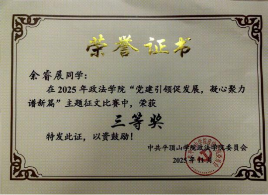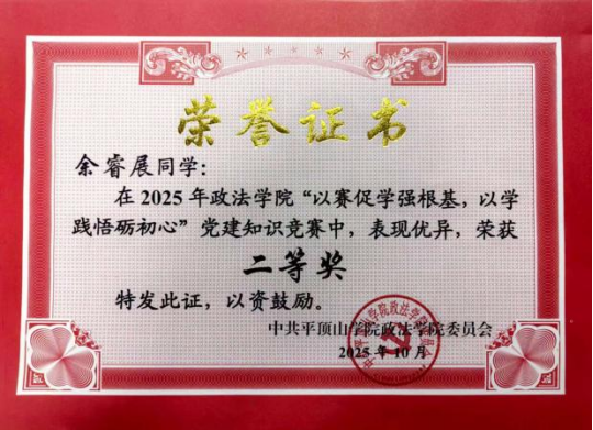 该生始终坚持“德智体美劳”五位一体全面发展,在文体活动与集体生活中绽放多元光彩。在体育竞技与集体活动中,凭借团队协作精神与不懈坚持,连续两年荣获“政法学院心理运动会一等奖”,参与“平顶山学院一二·九合唱比赛”获校赛一等奖,助力班级荣获“平顶山学院心理健康操三等奖”“政法学院心理情景剧三等奖”;在宿舍文化建设中,展现较强的生活技能与协作意识,荣获“平顶山学院宿舍技能运动会一等奖”;在个人特长培养上,兼顾文化素养与综合能力,各项荣誉覆盖文体、技能、实践等多个维度,以全面发展的姿态诠释新时代大学生的青春风采。