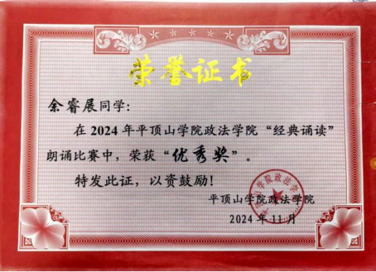 余睿展深知“立身以立学为先,立学以读书为本”,她始终保持勤奋踏实的学习态度,在专业领域深耕不辍。课内专注钻研法学专业知识,形成科学系统的学习方法,本学年学业及综合测评均位列班级第八,顺利通过普通话二级甲等考试。课外积极拓展知识边界,主动参与学科竞赛与学术实践,荣获“政法学院经典朗诵优秀奖”“平顶山学院春节书法比赛优秀奖”“政法学院‘法思杯’辩论赛优秀奖”等多项荣誉;同时深度参与科研实践,投身平顶山市社科联项目并成功立项,在理论与实践的结合中锤炼专业本领,实现学业与能力的双重提升。